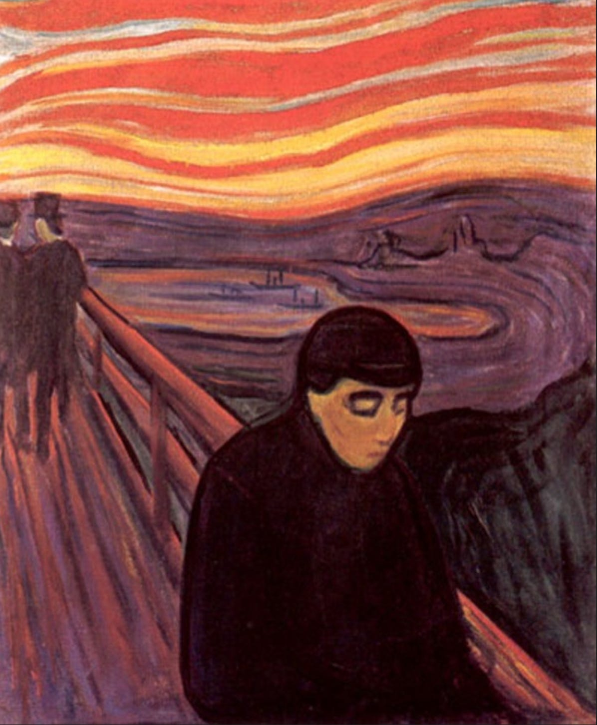 We see a man walking alone across a bridge. It’s the same scene as the famous ‘Scream’ painting, and yet it depicts a very different energy. This is not the agony of total despair, but rather a quiet, more subdued kind of pain. The anguish of doubt and inner turmoil, not the release of energy that comes with desperation.